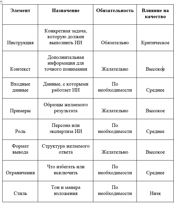 Эффективный промпт состоит из нескольких ключевых компонентов, каждый из которых выполняет определенную функцию: